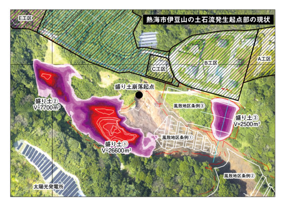 こうして2006年から、今回の災害の原因となった盛り土が始まる。盛り土は静岡県の県土採取等規制条例によっておこなわれたが、同条例は許可制ではなく届け出制だった(今も同じ)。そのうえ、盛り土は届け出た計画の1・5倍(約5万4000立方㍍、高さ50㍍)にもなる違法な状態だったことが明らかになっている。そして昨年の土石流災害は、この風致地区①から発災している。