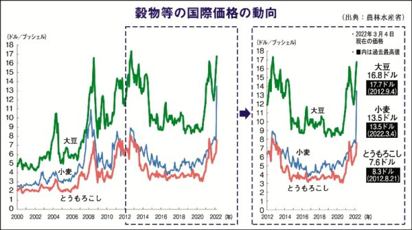 シカゴ市場の小麦・トウモロコシ・大豆の先物価格は今年に入って前年比でそれぞれ5割、3割、2割以上上昇した。