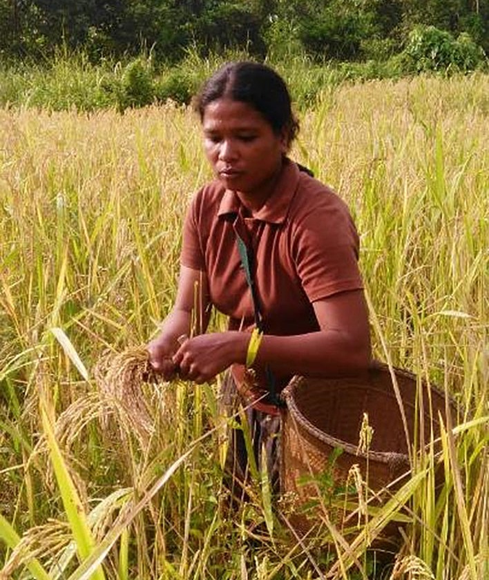陸稲の収穫をおこなう先住民族パラワンの女性