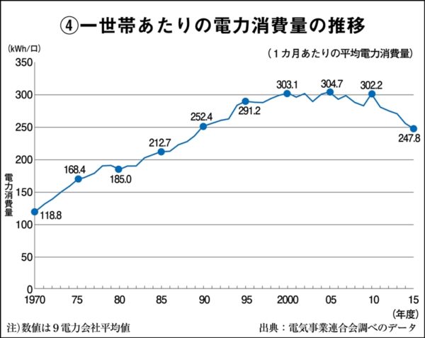 電力の消費量を見ると、産業用も家庭用も減少傾向にある【グラフ③④参照】。省エネ推進や人口減少、海外への工場移転などが進み、今後電力需要が増える見通しはない。日本総研は2050年までの30年間で電力需要は23・4%減少すると予測している。減少幅はそれ以上だと見る専門家もいる。そのもとでの昨今の「電力不足」は、実際に電力供給能力がないのではなく、「電力自由化」や「再エネ推進」といった政府の政策に根源がある。