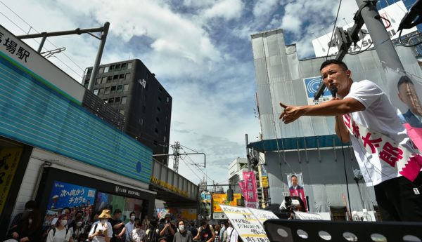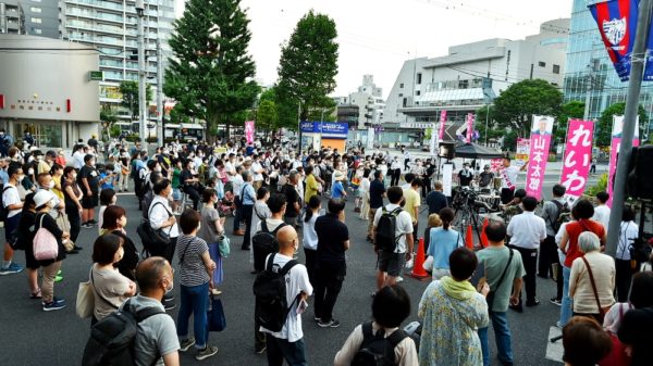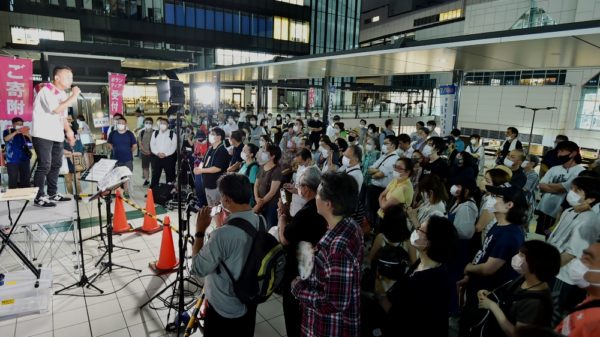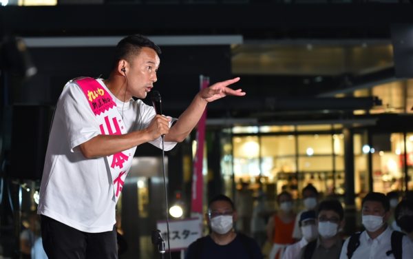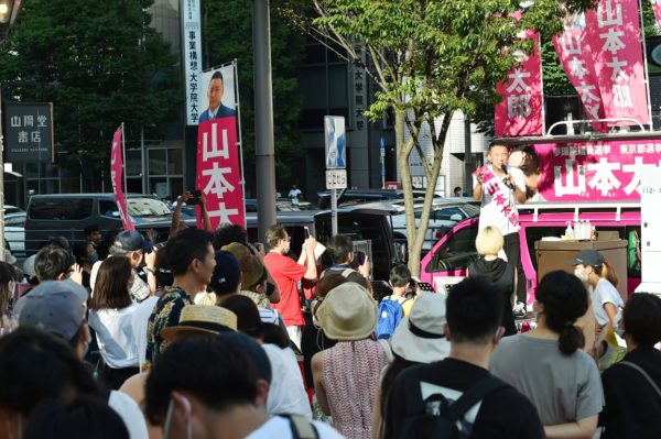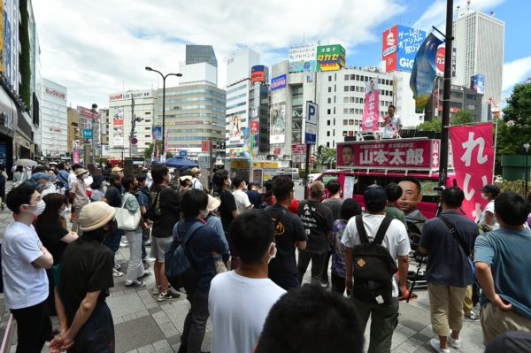 参院選(7月10日投開票)で東京選挙区から出馬した、れいわ新選組の山本太郎代表は、都内で遊説活動を旺盛におこなっている。6月27日には、時折ゲリラ街宣も交えながら、明大前駅前、調布駅前、府中駅前などで街頭演説や聴衆との質疑応答をおこなった。街宣には、学生、主婦、子連れの親世代、高齢者、会社員など幅広い世代の人々が足を止め、演説が始まるとその熱気に引き寄せられるようにその数が増していくのが特徴となっている。
