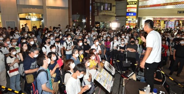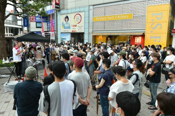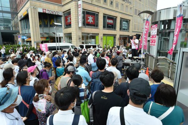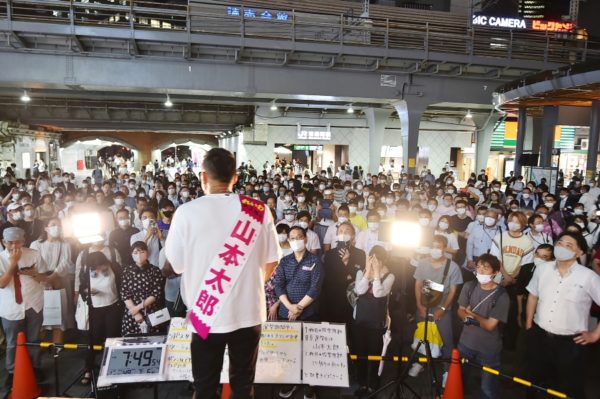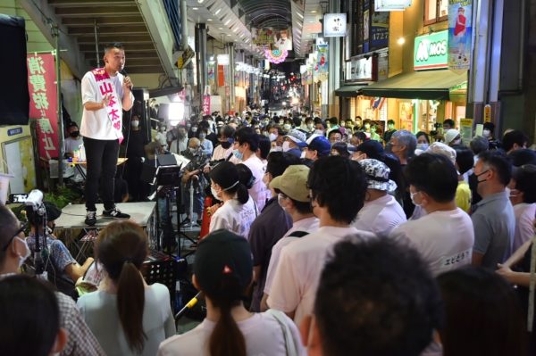 「“あなたがたとえどんな状況になったとしても、国は絶対に見捨てない。全力で好きなように生きてくれ。困ったときにも、困る前にもあなたに手を差し伸べる”――もしも、そういう国があったとするならば、私は世界最強の国になると思う。それぞれが持っている力を100%発揮できる国だ。この仕事を失ったらもう自分の人生は終わりだと思い込まされてブラック企業に使い潰される、それらのために自分の価値を示し続けなければ社会から認められなかったり、誰かの足を引っ張ってでもよじ登らなければならないという空気のなか、生産性で人間の価値がはかられるような社会を極めていけば、死にたくなるのは当然だ。10代から30代まで死ぬ原因の1位が自殺。大人から子どもまで死にたくなるような社会、それはもう国ではなく、地獄と呼ぶしかない。その地獄を作ったのも政治なら、変えられるのも政治。その政治は、この国のオーナーである皆さんの力がなければ変えられない。50%の人々が投票を諦めている。その力を合わせていきながら、これまでと違う社会、生きていたいと思える社会をみんなで作っていこう」――切々と語りかける山本氏の訴えに、雑踏のなかから1人、2人と足を止め、その輪は次第に膨らんでいく。高齢者から10代、20代までが真剣なまなざしを向けるその営みは、地道ではあるが着実に浸透を見せ、選挙戦終盤の追い込みに向けてラストスパートに入っている。