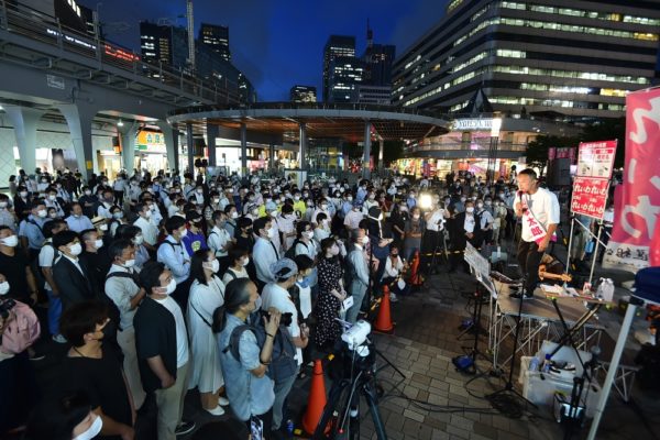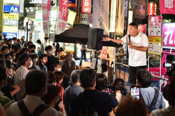「皆さんの存在は希望でしかない。50%の人たちが選挙に参加していないもとで、財界や大企業による一部のための政治がおこなわれてきた30年。デフレ不況が長引き、貧困は拡大し、自殺が10~30代の死因第1位を占める国になった。こんな地獄のような国をつくったのが政治なら、それを変えられるのも政治。投票を捨ててきたみんなが力を合わせれば必ず変えていける。永田町の空気を読まず、徹底的に抗う者たちを国会に送り込んでほしい!」――参院選(7月10日投開票)が大詰めを迎えた東京都内で、れいわ新選組・山本太郎の訴えが響く。賑やかな選挙フェスを交えながら、ターミナル駅頭、商店街、街角でのゲリラ街宣や練り歩きを続けるれいわ新選組の選挙戦は、最終盤に向けて地べたを這うように都内を縦横無尽に駆け巡る。メディアによる「与党優勢」のアナウンスがもたらす白けムードを払拭し、不特定多数の心に切々と訴えかける粘り強いたたかいは、水面下で鬱積する人々の政治要求と繋がりながら着実にその力を束ねている。