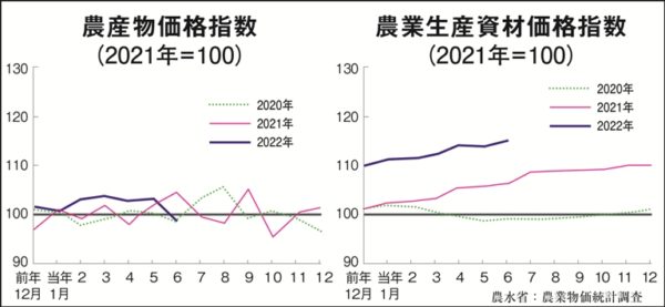 農水省がまとめている「農業物価指数」を見てみると、直近の今年6月時点の指標で、資材価格は2020年を100とした指数は前年同月より8・5%上がって115だった。