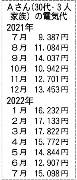30代の女性Aさん(3人家族)の1年間の電気代の推移を見せてもらうと、昨年7月に約9000円だったものが、今年7月は1万5000円をこえていて、およそ6000円値上がりしていた【表参照】。この3年、コロナ禍で自宅時間が増え、どの家庭もただでさえ光熱水道費の上昇に悩まされてきたところだ。