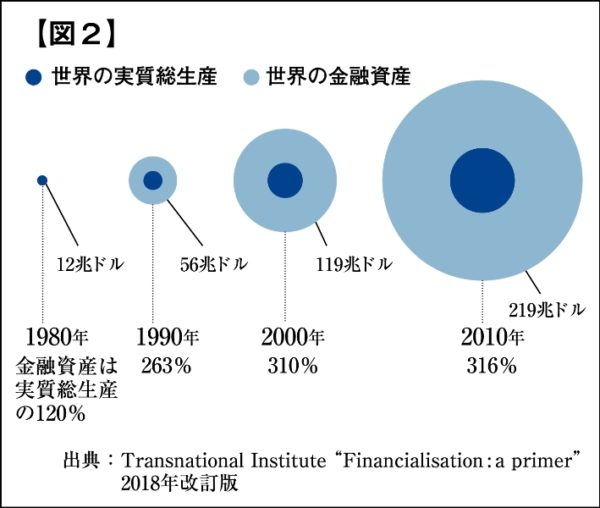 国際NGOのトランスナショナル・インスティテュートによると、80年代はまだ実体経済と金融資産の規模は同じくらいだったが、金融資産はその後膨張し続け、今や実体経済の約3倍もの金融資産が世界に存在するという。金融資産は常にさらなる増殖を求めて投機先を探す。それがあちこちの取引に流入し、小麦など食料のコモディティー取引にも入ってきているし、世界の農地も買い占めている。つまり、経済全体が金融化(ファイナンシャリゼーション)され、すべての取引がマネーゲームになってしまっているということだ。