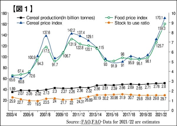「GRAIN(グレイン)」という国際NGOは、問題は食料不足というより、価格が高くなって買えない問題だ。買えないのはもちろん手持ちのお金がないからであり、賃金や経済格差の問題だといっている。ここにはウクライナでの戦争よりずっと根深い構造的な問題があり、食料価格や農地を巻き込んだ「金融化」における投機、食や農がマネーゲームのコマになっていることも大きな問題だと指摘している。グレインの報告書によると、2003年以降、世界の穀物生産量(太い実線)はゆるやかに増加しつつ安定している。それに対して穀物価格指数(破線)は大きく上下している【図1】(*2)。