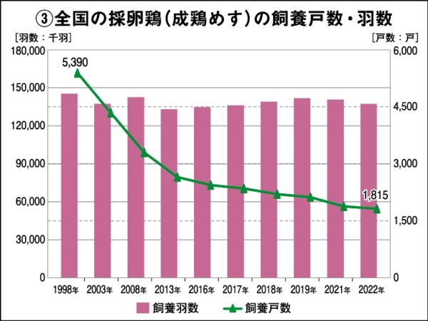 このように被害が拡大し、殺処分羽数が膨れあがる現象の背景には、農場が大規模化していることも要因との指摘もある。全国の採卵鶏の飼養戸数と羽数の変遷【図3】を見てみると、1998年には5390戸あった養鶏場が、今年までに1815戸まで減少している。一方で、飼養羽数はほぼ横ばいとなっており、1戸あたりの平均飼養羽数が大幅に増えていることがわかる。
