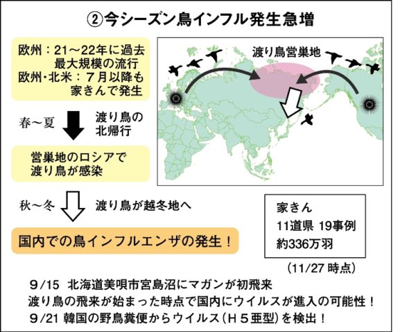 日本国内では11月27日現在、11都道府県、19事例の鳥インフルエンザ感染が発覚しており、すでに約336万羽が殺処分対象となっている。昨シーズンは、最初の鳥インフルエンザ感染が2021年11月10日に発覚し、その後今年5月14日までの間に計25事例、189万羽が殺処分された。今シーズンは1カ月も経たないうちに昨シーズンをこえ、2倍に迫る被害が出ている。なかでも11月4日に感染が発生した茨城県の養鶏場では約104万羽が殺処分され、他にも岡山県の養鶏場で約51万羽、鹿児島県の養鶏場で47万羽、北海道の養鶏場で17万羽、青森県と鹿児島県の養鶏場で約12万羽が殺処分されるなど、大規模な被害が全国に広がっている。
