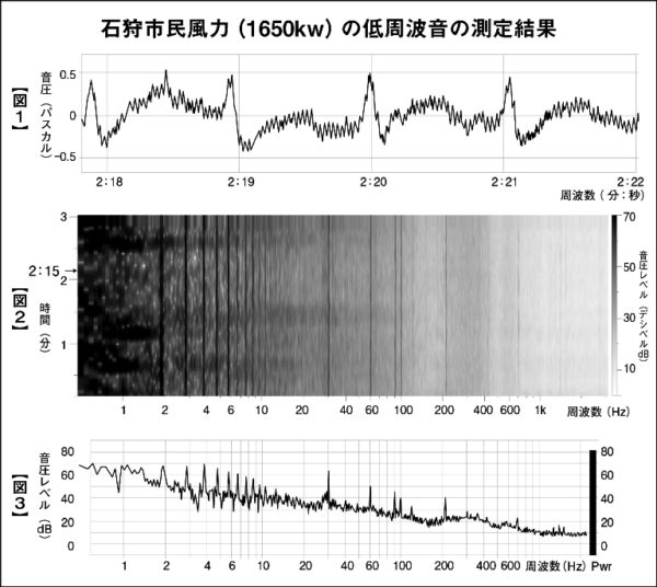 別の1500㌔㍗風車の近くに住む人が、深夜に頭痛で目を覚ましたときに寝室で測定した結果も、翼回転に連動する基本音の高調波音で暗騒音を上回っていた。この人は、この風車から2㌔離れた所に行くと睡眠障害や頭痛などが改善されたといっており、その後転居した。日本科学者会議の会員には、石狩に多数の風車が建って以来、風車から2㌔以内に近づくと体調不良となり、数時間の滞在で帰宅後に多大な疲労感に襲われる人がいる。北西風が強い冬に体調を崩すことが多く、住宅が沿岸部に林立する風車の風下で、とくに減衰しがたい低周波音が遠方まで届くことがある。