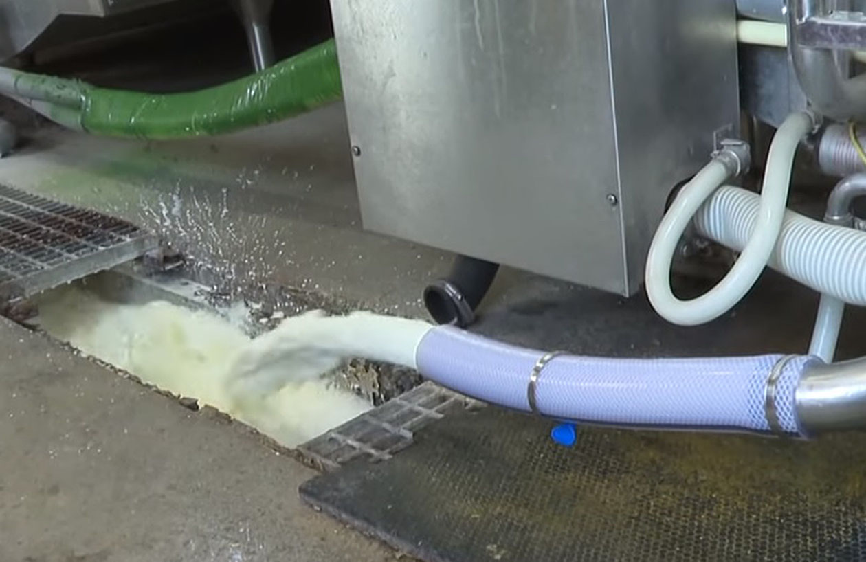 生産抑制のため排水溝に廃棄される牛乳(北海道)