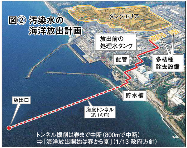 汚染水の海洋放出は、沖合1㌔まで海底トンネルを掘ってそこから放出する計画だ【図2】。国や東電は福島県知事の了解を得ないと海底トンネルをつくれないが、福島県の内堀知事は昨年8月に許可した。汚染水問題をめぐっては、岸田政権と福島県政は一体となって進めようとしている。