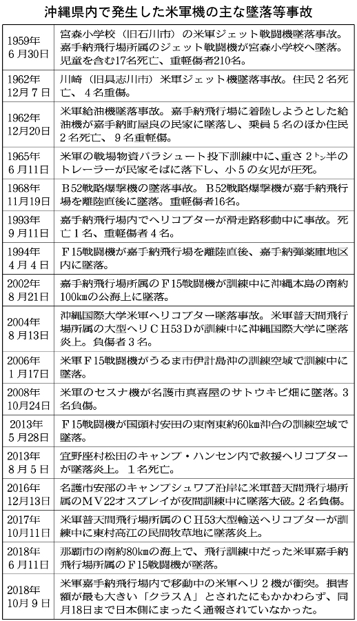 その後も死亡者が出るような米軍機の墜落事故が頻繁に起きている【表】。とくに衝撃的だった事故は、2004年8月に起きた沖縄国際大学米軍ヘリ墜落事故だ。ちょうど夏休み中だった大学の校舎をかすって大学敷地内に米軍大型ヘリが墜落し炎上した。
