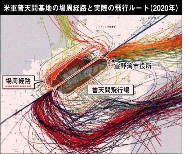 ちなみに、米軍側は基地の「場周経路」(離発着時の標準飛行ルート)を示しているが、実際に普天間基地を離発着している経路は【図】の通りだ。飛行する場所は場周経路に収まるものでは、まったくないことも参考にしてもらいたい。