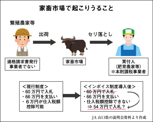 市内に繁殖農家は58軒あるが、そのなかには母牛を1、2頭飼って、年間に1頭程度、子牛を出荷するという零細な繁殖農家もいる。農協の説明によると、こうした小規模な繁殖農家が免税事業者のままでいた場合、家畜市場でおこなわれるセリで、買い付け人(肥育農家など)が消費税分を減額した価格で入札する可能性があるということだった【図参照】。