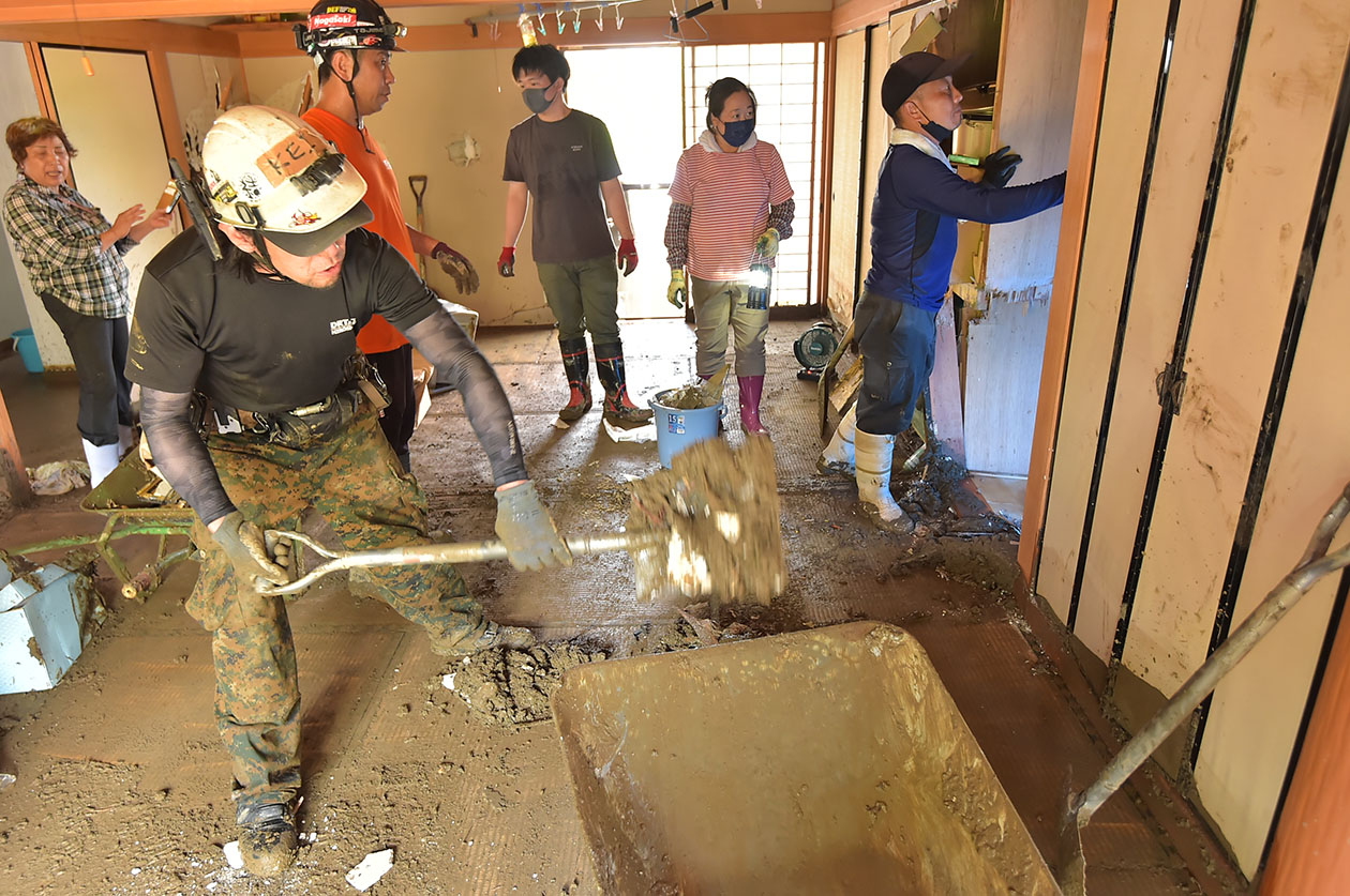 県外からのボランティアの力も借りて家の中の土砂を撤去する(12日、久留米市田主丸町)