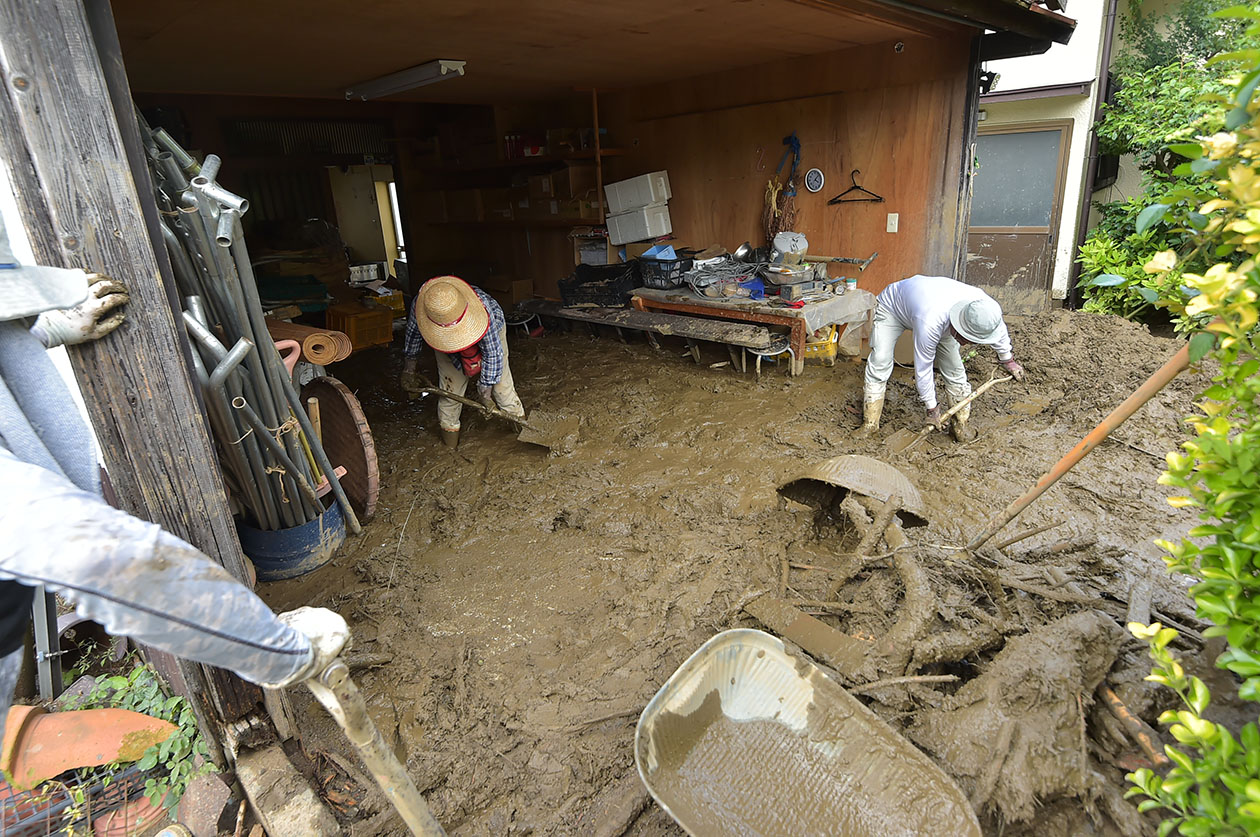 蒸し暑さのなか、家族総出で家の敷地内の泥を撤去する(12日、久留米市田主丸町)