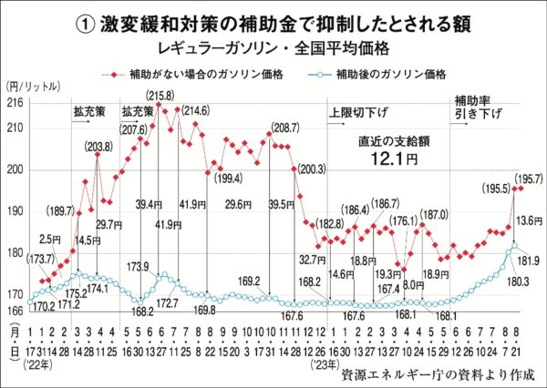 政府は「燃料価格激変緩和対策事業」として2022年1月から石油元売り各社(エネオス、出光、コスモ石油など)に補助金を支給してきた。ガソリン、軽油、灯油、重油に2023年は航空機燃料も加わった。予算は約6兆2000億円だ。
