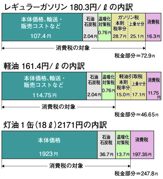 とくに二重課税の幅が大きいレギュラーガソリンは、本体価格が上がり、税金額が増えると、それにともなって消費税額も増加する構造が放置され続けており、国民生活は厳しくなるが、税収は増加するという異常な状態になっている。