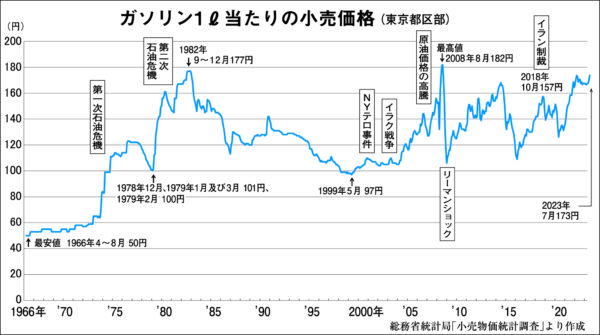 もともと終戦直後のガソリン代は税金が十数円だったため50円を切っていた。その後の増税を加味しても、1970年代までガソリン代は1㍑50円台を維持していた。しかし、1956年に軽油引取税(道路を使わない船やユンボなどは免除)が、1974年にガソリン税が「道路整備財源の確保」を掲げて導入された。このとき、道路整備の財源が不足していることを理由に、1㍑53・8円の「暫定税率」が適用されたが、小泉改革のもとでガソリン税が「一般財源」に移行(2009年)され、その意味がなくなったにもかかわらず、なぜか「暫定税率」は「特例税率」に名前をかえて維持され続けている。