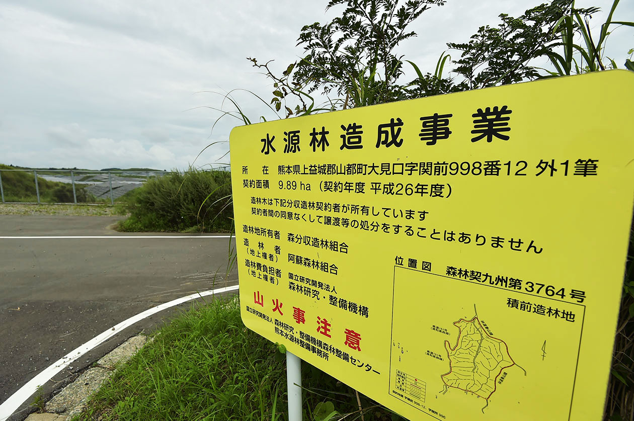 太陽光発電所の付近にある「水源林造成事業」の看板