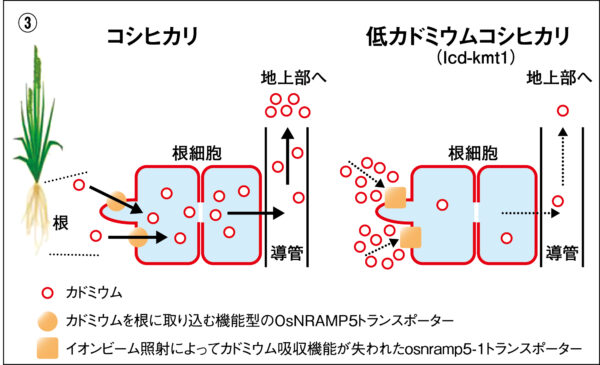 この研究は2010年ごろから始まった。この時点では稲がカドミウムを吸収するメカニズムは分かっていなかった。そこで、3000個のコシヒカリの種子に重イオンビームを照射して栽培してみると、そのなかで3つだけカドミウムをほとんど吸収しない品種が見つかった。それを遺伝子解析すると「OsNRAMP5」という遺伝子が壊れており、この遺伝子が壊れるとカドミウムをほとんど吸収しないということがわかった【図③】。