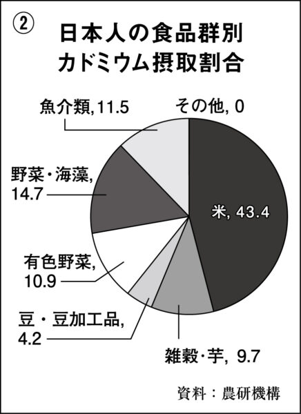 ただ、日本人の食品群別カドミウム摂取割合【図②】を見てみると、米が43・4%を占めており、今後も対策は必要だ。一方で、残りの食品で汚染があるのも事実で、米だけ対策をしていてもだめだと私は思う。
