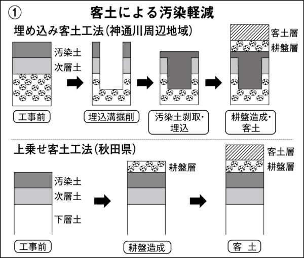 カドミウムは除去しない限り表層30㌢の表土に留まり続ける。さらに降雨によって地下水帯まで達する可能性もある。そのため神通川流域では「埋め込み客土工法」という対策がおこなわれた【図①】。この工法はその場に穴を掘って汚染土壌を埋め込み、その上から他の土(客土)を被せ、さらにその上から耕作用の土を敷きならすというものだ。これによって神通川流域では汚染が大幅に改善された。