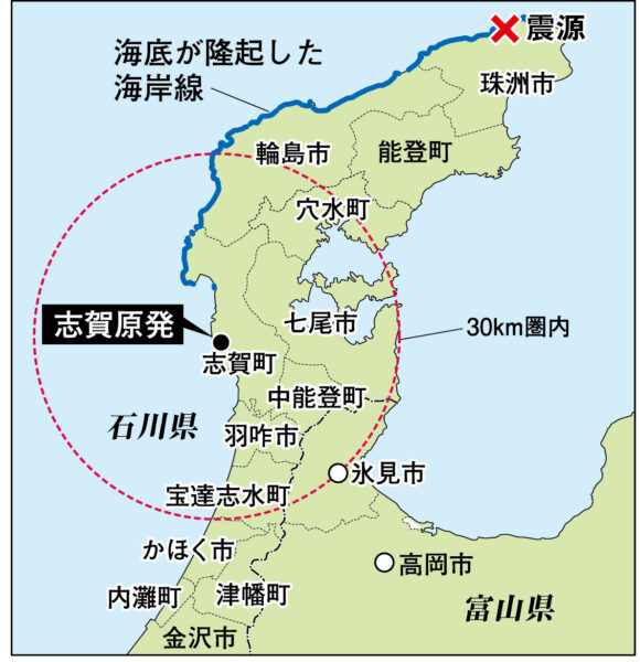 1月1日午後4時10分の地震発生直後、NHKをはじめとするテレビ各局は「志賀原発は異常なし」とする電力会社の発表を速報で流した。しかし、志賀町の最大震度7は、2011年3月11日の東日本大震災で福島県を襲った震度(6強)を上回っており、「原発が無傷で済むレベルではない」と誰もが直感する揺れだ。さらに能登半島北部では、海底が数㍍隆起して陸地化する現象が海岸線の85㌔にわたって発生【地図参照】。国土地理院が示したデータでは、海岸線の隆起は志賀原発の北7㌔地点にまで迫っていた。