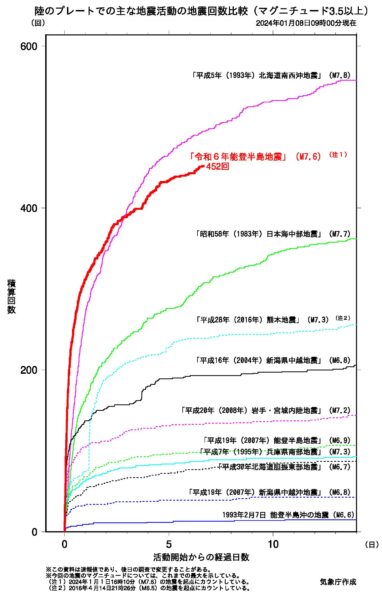 また今回の能登半島地震では、本震だけでなく、マグニチュード3・5以上の群発地震が連日のように続いており、日本列島で起きた過去の地震と比べてもその回数は抜きん出て多く、今後いつまで続くのかはわかっていない【気象庁作成のグラフ参照】。
