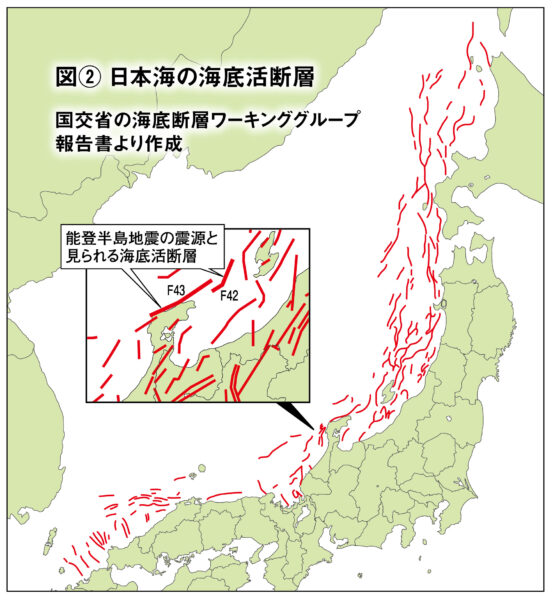 ところが、海底活断層はそれができていない。能登半島地震の震源になったと見られる「F43」「F42」と呼ばれる2本の海底活断層について、政府による調査も評価もおこなわれていなかった。だから石川県は、この海底活断層を地震予測の想定に入れていなかった。