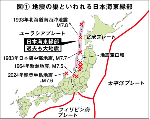 日本海のユーラシアプレートと北米プレートの境界、日本海東縁部は、地震の巣になっている【図①参照】。