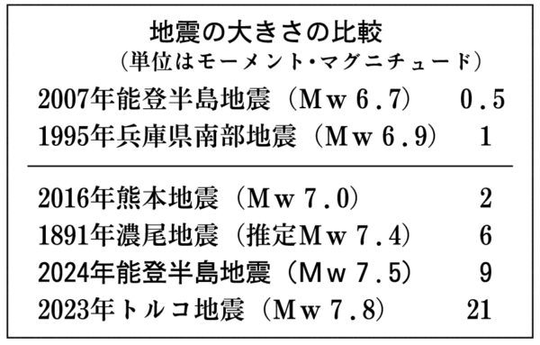 どれだけすごいエネルギーかというと、29年前の1月17日に発生した阪神淡路大震災のエネルギーを一とすると、その9倍だ【表参照】。きわめて大きな破壊力を持った地震だった。