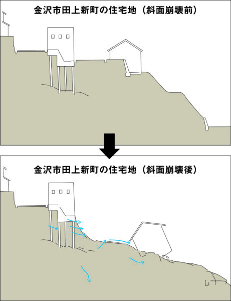 これもニュースになったが、金沢市田上新町の住宅地では、震度5弱で、斜面が崩壊して3棟の家が滑り落ちた。崩壊したすぐ上に、建築中の地上2階、地下1階の鉄筋コンクリートの建物があった。そこの際(きわ)から崩れ、道路と向かいの家を巻き込んで崩壊した。段々状の傾斜地に家を建て、擁壁をつくっている。