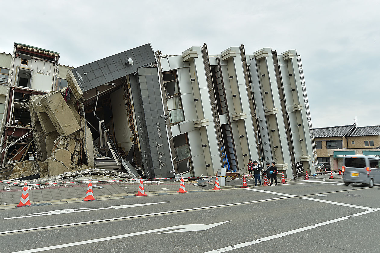 根こそぎ倒れたままの「美術漆芸苑五島屋」のビル(輪島市)