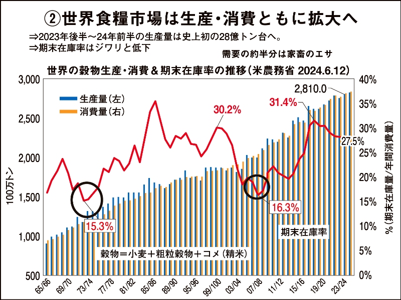 そして消費が増大しているが、その約半分がエサの需要だ。小麦は約2割、トウモロコシは世界の生産量13億㌧のうち7億6000万㌧、大豆も2~3割がエサになっている。