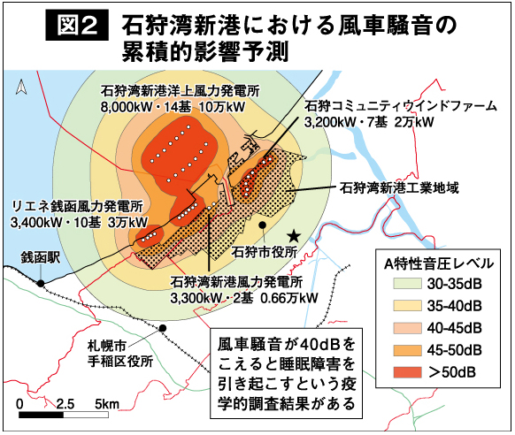 そのなかで田鎖氏は、国が北海道の日本海側、石狩市沖から岩宇・南後志地区沖、島牧沖、檜山沖、松前沖の5つの海域を洋上風力の「有望な区域」に指定しており(いずれも離岸距離は5㌔以内)、合計出力が300万~500万㌔㍗で、これほど近海にこれほど大規模な洋上風力発電の建設を計画した例は世界にないが、国の計画では騒音(大きな低周波成分を含む)の影響はまったく考慮されていないとのべた。