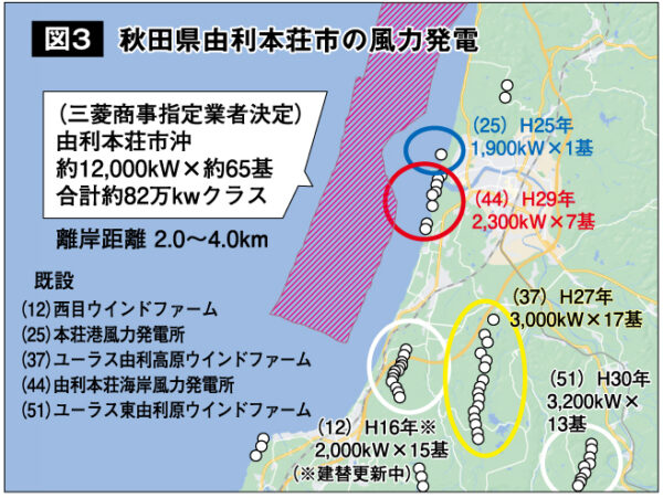 秋田県では現在、陸上風車が284基(66万㌔㍗)稼働しており、洋上風車は港湾区域で33基(13万8000㌔㍗)が稼働している。由利本荘市はすでに多くの風車に囲まれており、そこに新たに巨大洋上風車の計画が、離岸距離わずか2㌔のところに持ち上がって市民がたいへん心配している【図3参照】。離岸距離が近いと、騒音・低周波音の影響や景観への影響が大きい。