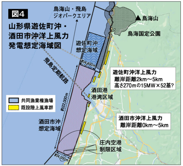 遊佐町の洋上風力発電計画だが、現在、促進区域に指定されている。離岸距離が2~5㌔で、高さ270㍍、単機出力1万5000㌔㍗の風車を52基程度建てるといっている。それに続いて持ち上がったのが酒田市沖洋上風力発電計画で、現在有望な区域になっており、離岸距離は0~5㌔だ。これも最大出力50万4000㌔㍗という巨大な計画になっている【図4参照】。