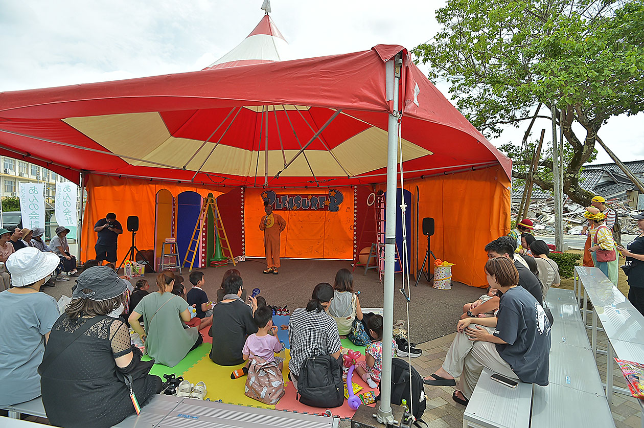 避難所の小学校では慰問に来たサーカス団が訪れ、親子連れが集まっていた(24日、珠洲市)