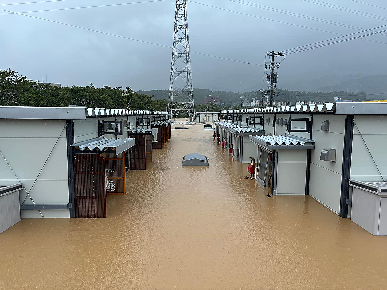 豪雨で水没した仮設住宅(21日、輪島市宅田町。「コミサポひろしま」小玉幸浩氏提供)