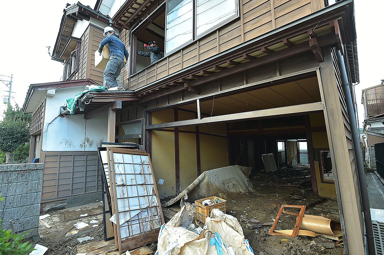 地震で歪み、豪雨で土砂が流れ込んだ民家の解体作業
