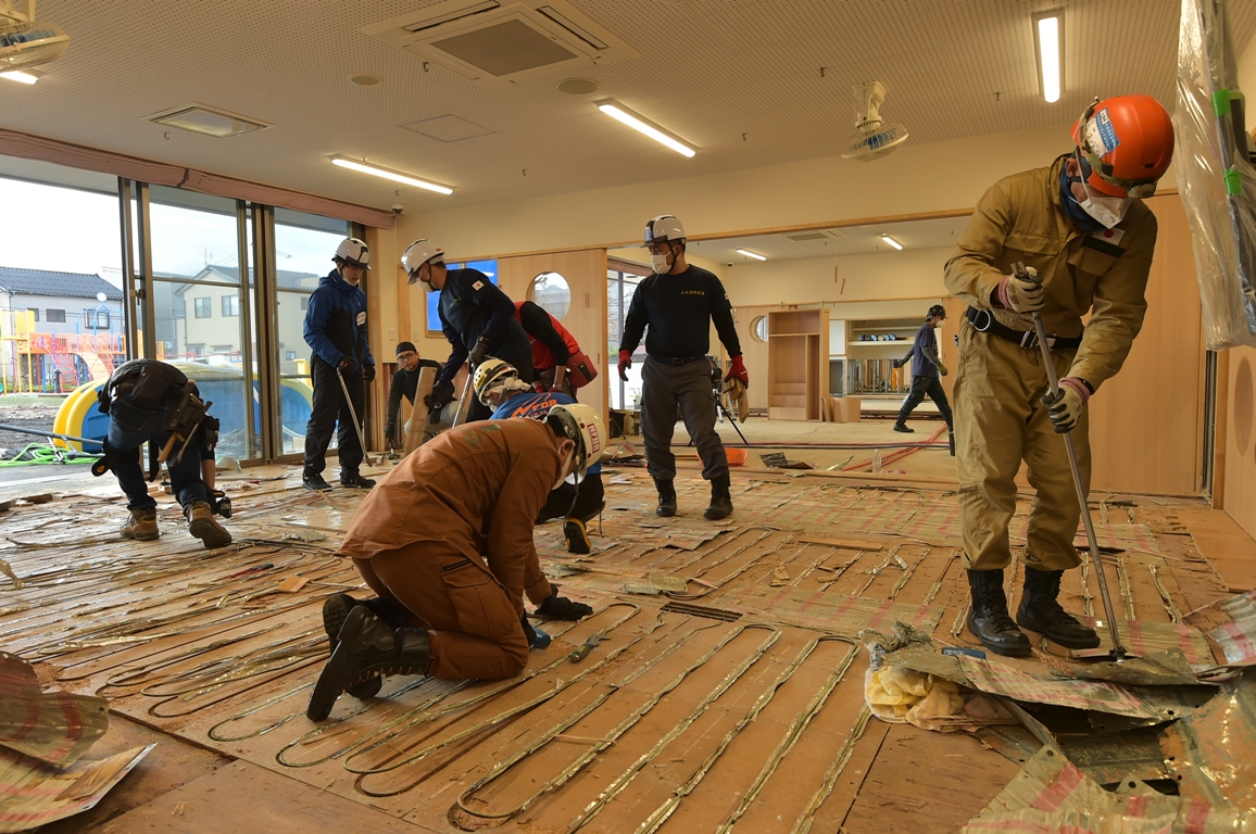 泥水に浸かった幼稚園の床板をはぐ災害ボランティアたち(23日、輪島市河井町)