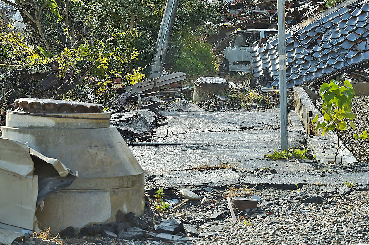 市内では地震による隆起で1㍍以上突き出したマンホールやアスファルトが波打っている場所も多い(11月28日、珠洲市宝立町)