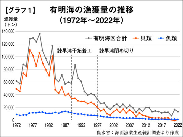 有明海全体の漁獲量の推移について、ノリなどの養殖を除く魚類と貝類、そしてイカやタコ、海藻などをあわせた合計の3項目を1972年から50年間調べた【グラフ1】。1990年に大きく漁獲量が増えているのは熊本県のオゴノリが大きく増えたことによるもので、80年代から漁獲量の減少が続いており、亡くなられた長崎大学の東幹夫先生は、「すべて諫早湾干拓が原因というわけではないが、あいつぐ有明海の開発で潜在的だった変化が一気に顕在化し、その引き金を引いた開発こそが諫早湾の閉め切りだった」と指摘している。