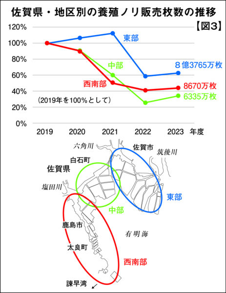佐賀県西南部でノリの不作が深刻になっている鹿島のノリ養殖漁師は「再生事業にはあまり期待していない。今まで何年も再生事業がおこなわれているが、良くなったという気がしない。ノリはこの3年間ずっと色落ちが続いている。本来今が一番忙しい時期であるにもかかわらず、ここに来られるということは今年も悪いということだ。例年なら冷凍網の張り込みの時期なのだが、海の栄養塩が回復しないため今は見合わせ中だ。去年も一昨年も同じような状態で、一昨年は見切り発車で正月明けからすぐに冷凍網を張り込んだのだが、それが良くなくて、去年は1カ月待って2月の初めに張り込んだ。しかしそれもあまり芳しくなかった。今年もどうしようかと様子を見ているところだ。時期をずらすなどしてなんとかノリ養殖をやっていっているが、タイラギなど底物がとれるようにならなければ海の再生は難しいと思う」とのべた。