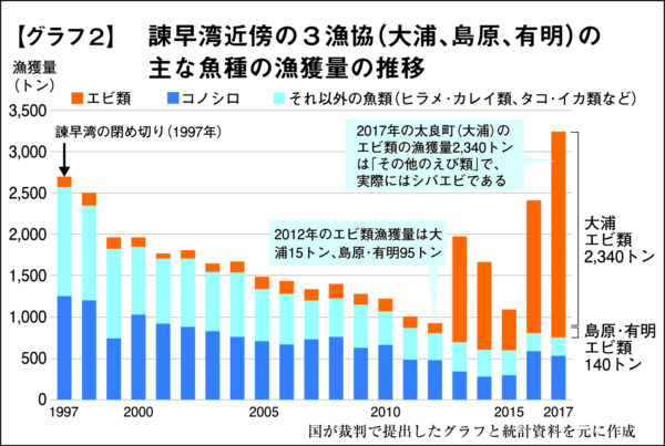 次のグラフ【グラフ2】は、国が諫早湾近傍部で2013年を境にして漁獲量が増加傾向に転じたと主張するグラフだ。増えているのは大浦のエビ類(シバエビ)だけだ。これまでエビ類の統計にはクルマエビがかなりあったのだが、1999年頃からとれなくなりシバエビがほとんどになっている。しかし国はこれにより諫早湾近傍部の漁獲量が連続して増加している、漁場環境が改善ないしは資源が回復していると主張し、裁判所もこれを採用した。ちなみに主な魚種には、ビゼンクラゲの漁獲量急増も入っている。