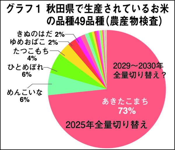 ところが秋田県は放射線育種米の「コシヒカリ環1号」と掛け合わせて開発した「あきたこまちR」へ全量転換しようとしている【グラフ1】。これは賢明な選択だろうか。秋田県は「安全に違いない」という推論のみで安全性を確認できるデータを持っていない。それと「あきたこまちR」には直接、放射線を当てていないから放射線育種はしていないといっている。