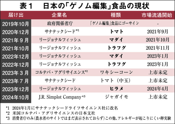 日本では「ゲノム編集」のトマト、魚、トラフグ、マダイ、ヒラメの市場流通が始まった【表1】。トマトはすでにスーパーで販売が始まってしまった。最初は熊本県で栽培されていたが関東に広がり、東京のスーパーで売られるようになっている。10粒ぐらいのトマトが売値で600円をこしている。有機トマトでも買える値段だ。「ハイGABAトマト」「高機能性食品」「リラックスする上で役立ちます」という宣伝を見て、買う人もいると思う。