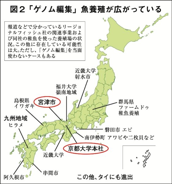 「ゲノム編集」の魚は、京都大学、近畿大学が開発し、京都の宮津市に養殖場を置き、同市のふるさと納税の返礼品になっていたりした。これが全国、とくに九州で広がろうとしている【図2】。宮城県でも広がっている可能性がある。今、漁場が大変だということで陸上養殖が全国的に大ブームだ。そこで飼料争奪戦が起こっている。魚粉は輸入がほとんどなので円安で高くなっている。そこで「ゲノム編集」した海藻、藻、昆虫などを原料にした餌の研究開発がはじまっている。まだ流通していないが、魚もその飼料も「ゲノム編集」が広がりかねない。
